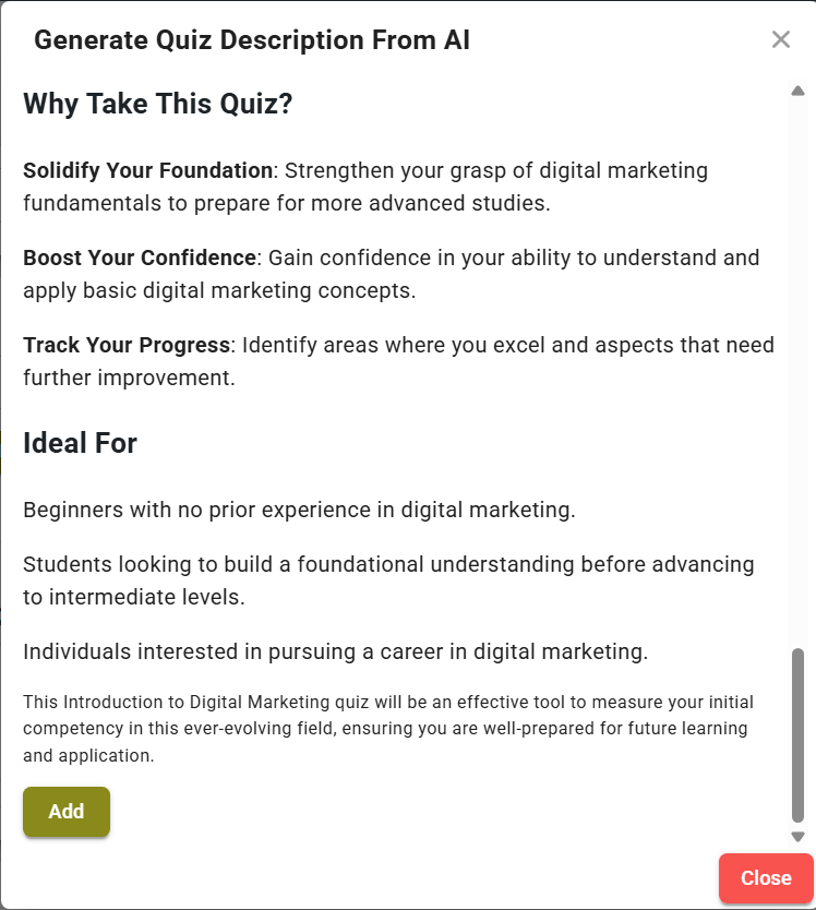 Within a few moments, AI will generate the Quiz description. Just scroll down and click Add button.