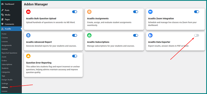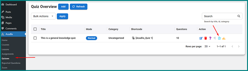 Navigate to the Quizzes from the left-hand Acadlix menu.