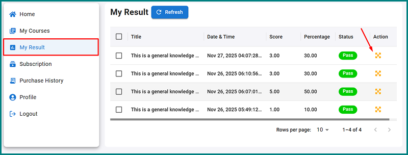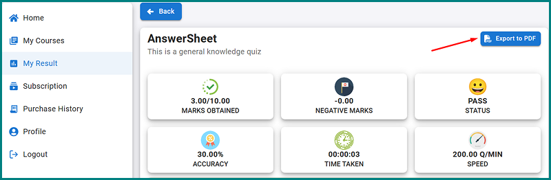 Select the Quiz for which you want to download the answer sheet and click on the “Result” icon.