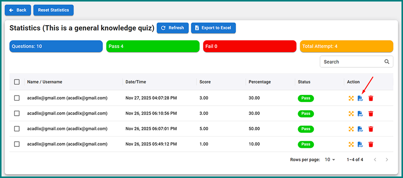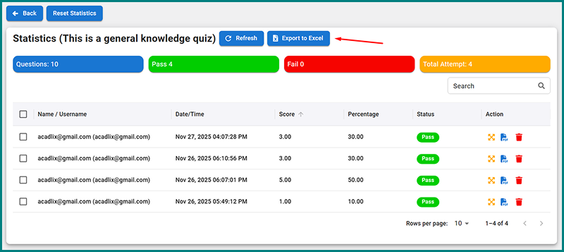We have added a feature so that the admin can download the summary of all attempts in an Excel file for a quiz. This will include data of all attempts, including the Student’s name, Student Email, Created At, Points, Result(%), Quiz Time, Accuracy, and Status.