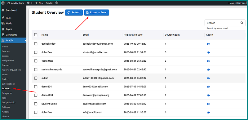We have added a feature that allows the admin to download an overview of enrolled students. This will include the details of Student Name, Student Email, Registered On, and Course Count.