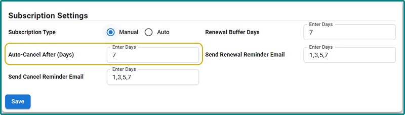 This will add a grace period to the subscription, and the subscription will be canceled after the set number of days from the renewal date if the student fails to make the payment. For example, if you set this to 7, the system will give 7 additional days to renew the current subscription. If the student still does not renew the subscription, it will be canceled after the set number of days.