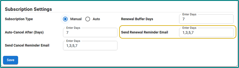 This feature allows you to send renewal reminder emails based on the buffer days you have set. You can add multiple days, separated by commas, to send renewal reminders. However, the highest value must be equal to or less than the buffer days.