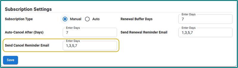 This feature allows you to send the cancel reminder emails based on the “Auto-Cancel After (Days)” set. You can add multiple days, separated by commas, to send cancel reminders. However, the highest value must be equal to or less than the “Auto-Cancel After (Days)”.