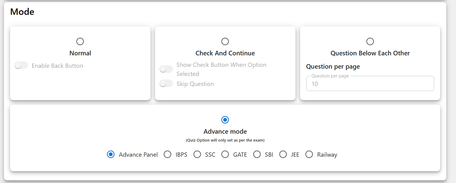 These modes helps you to provide different type of quizzes. You can further configure these modes with the different features available. Acadlix has follow modes