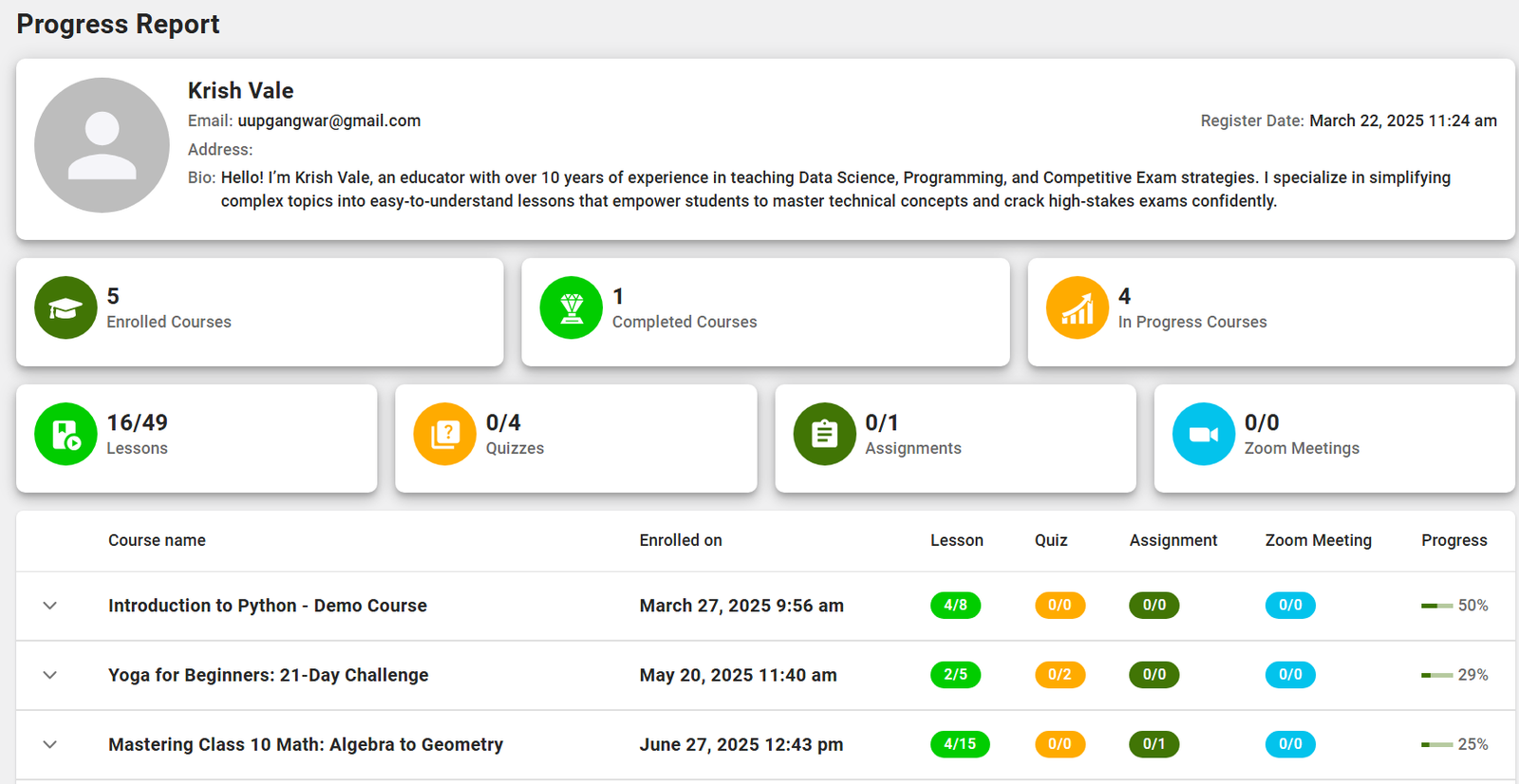 The student can check the purchase details, courses, result and answer sheets of all attempted quizzes and their user profile. But wait! We have also made this configurable, which means you can extend or shorten the student dashboard menu very easily.